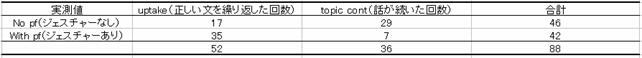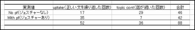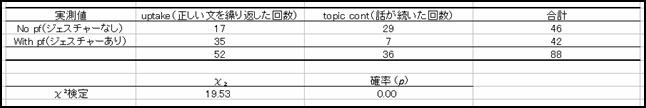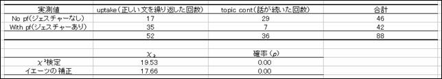 uƒWƒFƒXƒ`ƒƒ[‚ðŒð‚¦‚½ƒtƒB[ƒhƒoƒbƒN‚É‚¨‚¢‚ÄCŠwKŽÒ‚ªƒtƒB[ƒhƒoƒbƒN‚Å’ù³‚³‚ꂽ³‚µ‚¢•¶Í‚ðuptakeiŒJ‚è•Ô‚µ‚½j‰ñ”‚ÆCuptake‚·‚邱‚ƂȂC˜b‚ª‘±‚¢‚½‰ñ”‚ð‚܂Ƃ߂½‚à‚Ì‚ªã‚Ì•\‚Å‚ ‚éB‚±‚ê‚ç‚Ì·‚ðƒCƒG[ƒc‚̕Ⳃð—p‚¢‚½ƒJƒC“ñ敪͂ŕªÍ‚µ‚½‚Æ‚±‚ëCƒÔ2 (1, N = 88) = 17.66, p < .01‚Æ‚¢‚¤Œ‹‰Ê‚ƂȂèCƒWƒFƒXƒ`ƒƒ[‚ª‚ ‚邯‚«‚ƂȂ¢‚Æ‚«‚łͳ‚µ‚¢•¶Í‚ðuptake‚·‚é‰ñ”‚ªˆÙ‚Ȃ邩‚à‚µ‚ê‚È‚¢‚Æ‚¢‚¤‚±‚Æ‚ª–¾‚ç‚©‚ɂȂÁ‚½Bv