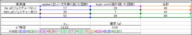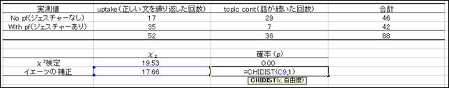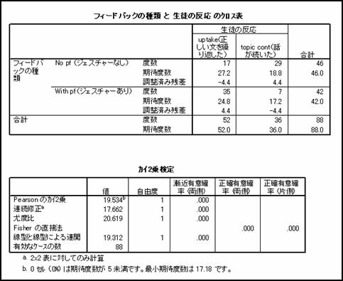 uƒWƒFƒXƒ`ƒƒ[‚ðŒð‚¦‚½ƒtƒB[ƒhƒoƒbƒN‚É‚¨‚¢‚ÄCŠwKŽÒ‚ªƒtƒB[ƒhƒoƒbƒN‚Å’ù³‚³‚ꂽ³‚µ‚¢•¶Í‚ðuptakeiŒJ‚è•Ô‚µ‚½j‰ñ”‚ÆCuptake‚·‚邱‚ƂȂC˜b‚ª‘±‚¢‚½‰ñ”‚ð‚܂Ƃ߂½‚à‚Ì‚ªã‚Ì•\‚Å‚ ‚éB‚±‚ê‚ç‚Ì·‚ðƒCƒG[ƒc‚Ì•â³[7]‚ð—p‚¢‚½ƒJƒC“ñ敪͂ŕªÍ‚µ‚½‚Æ‚±‚ëCƒÔ2 (1, N = 88) = 17.66, p < .01‚Æ‚¢‚¤Œ‹‰Ê‚ƂȂèCƒWƒFƒXƒ`ƒƒ[‚ª‚ ‚邯‚«‚ƂȂ¢‚Æ‚«‚łͳ‚µ‚¢•¶Í‚ðuptake‚·‚é‰ñ”‚ªˆÙ‚Ȃ邩‚à‚µ‚ê‚È‚¢‚Æ‚¢‚¤‚±‚Æ‚ª–¾‚ç‚©‚ɂȂÁ‚½B