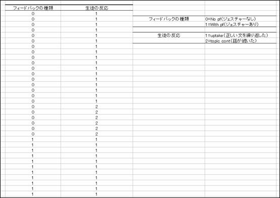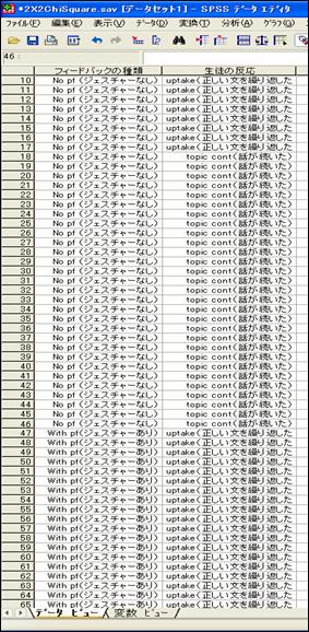 SPSS‚ðŽg‚Á‚½•ªÍ‚ł͈ȉº‚̂悤‚Ɉêl‚¸‚‚̉ñ“š‚ðƒtƒB[ƒhƒoƒbƒN‚ÌŽí—Þ‚Å‚Íu0=No pfiƒWƒFƒXƒ`ƒƒ[‚È‚µjvCu1=With pfiƒWƒFƒXƒ`ƒƒ[‚ ‚èjv‚Æ‚µC¶“k‚Ì”½‰ž‚Å‚Íu1=uptakei³‚µ‚¢•¶‚ðŒJ‚è•Ô‚µ‚½jvCu2=topic conti˜b‚ª‘±‚¢‚½jv‚Æ‚¢‚¤Œ`‚őł¿ž‚ñ‚¾‚à‚Ì‚ª•K—v‚Å‚·B